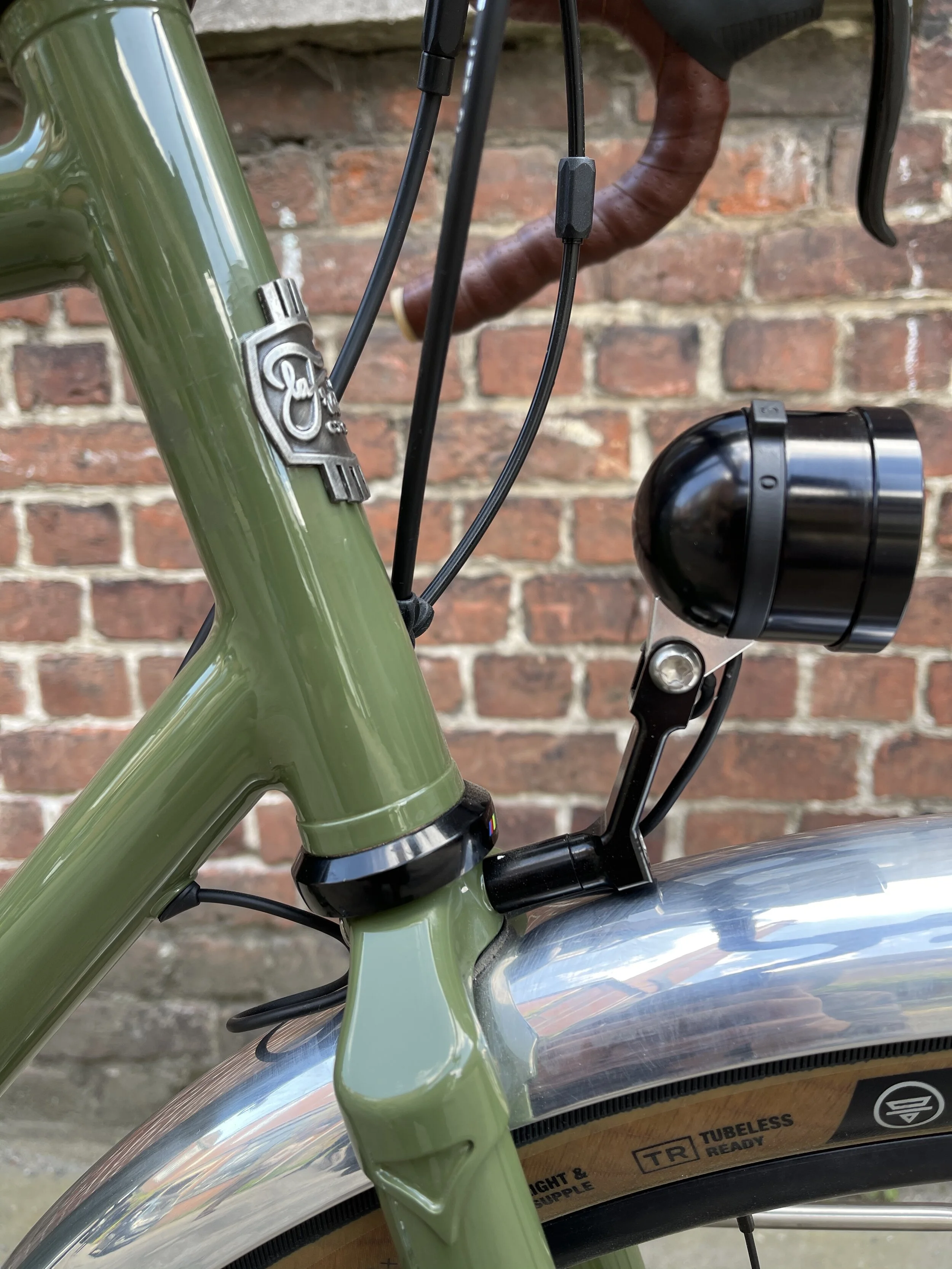 Et voilà, le vélo “All-road” d'Alain, fabriqué en acier Columbus Zona (cadre) et Reynolds 631 (fourche), est prêt à prendre la route, équipé des meilleurs composants durables. Les roues ont été construites par Matthias en utilisant nos jantes préférées Velocity Blunt SS, la dynamo SON à l'avant, le moyeu Hope Pro4 à l'arrière, et les pneus 650x47b Teravail Rampart.