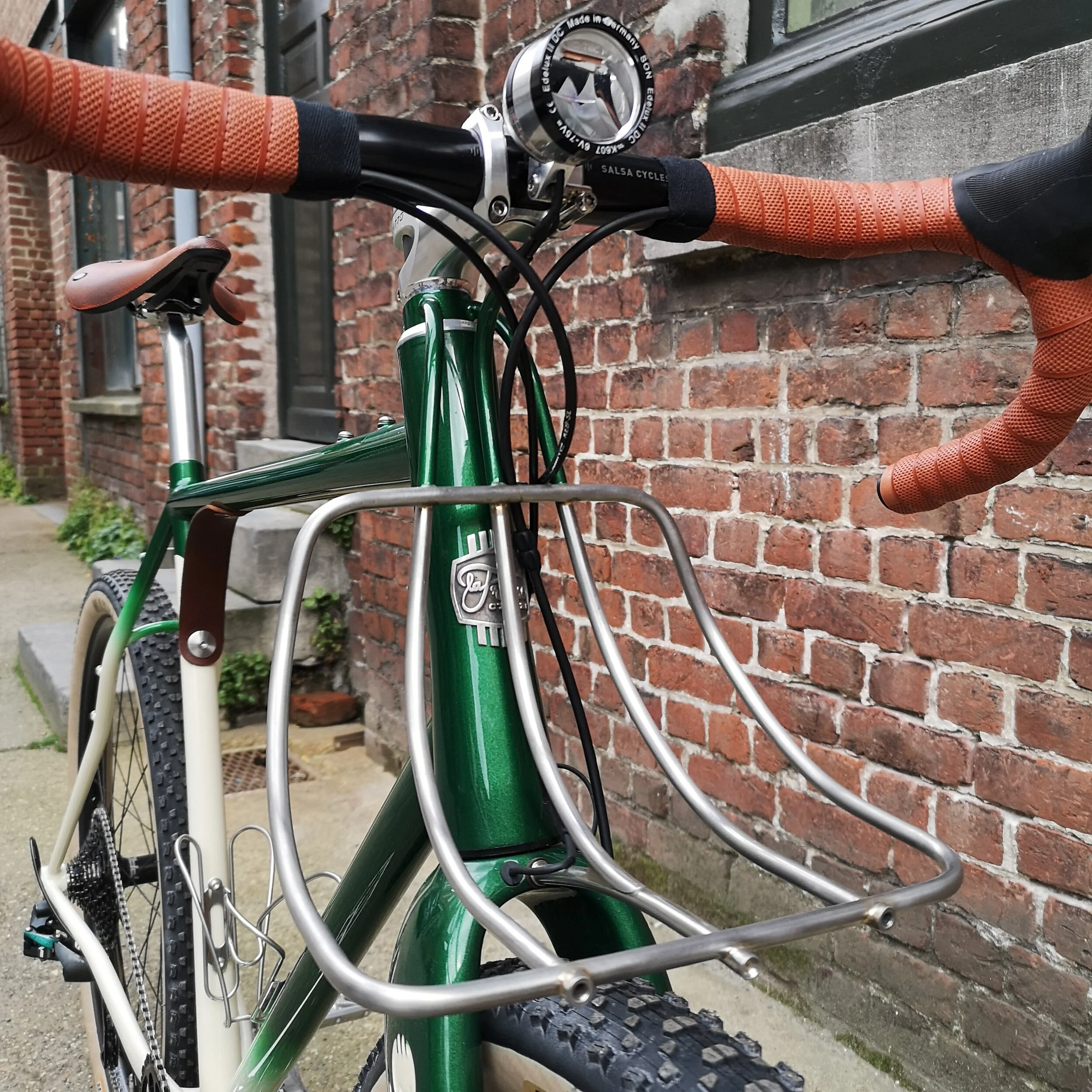 Le porte-bagages avant, création LaFraise, offre de nombreuses options pour attacher des “dry bags”, une tente ou un sac de couchage. Parmi les autres petits détails personnalisés, citons le minuscule support de feu avant et la bandoulière permettant de transporter le vélo lorsque rouler n'est plus une option.