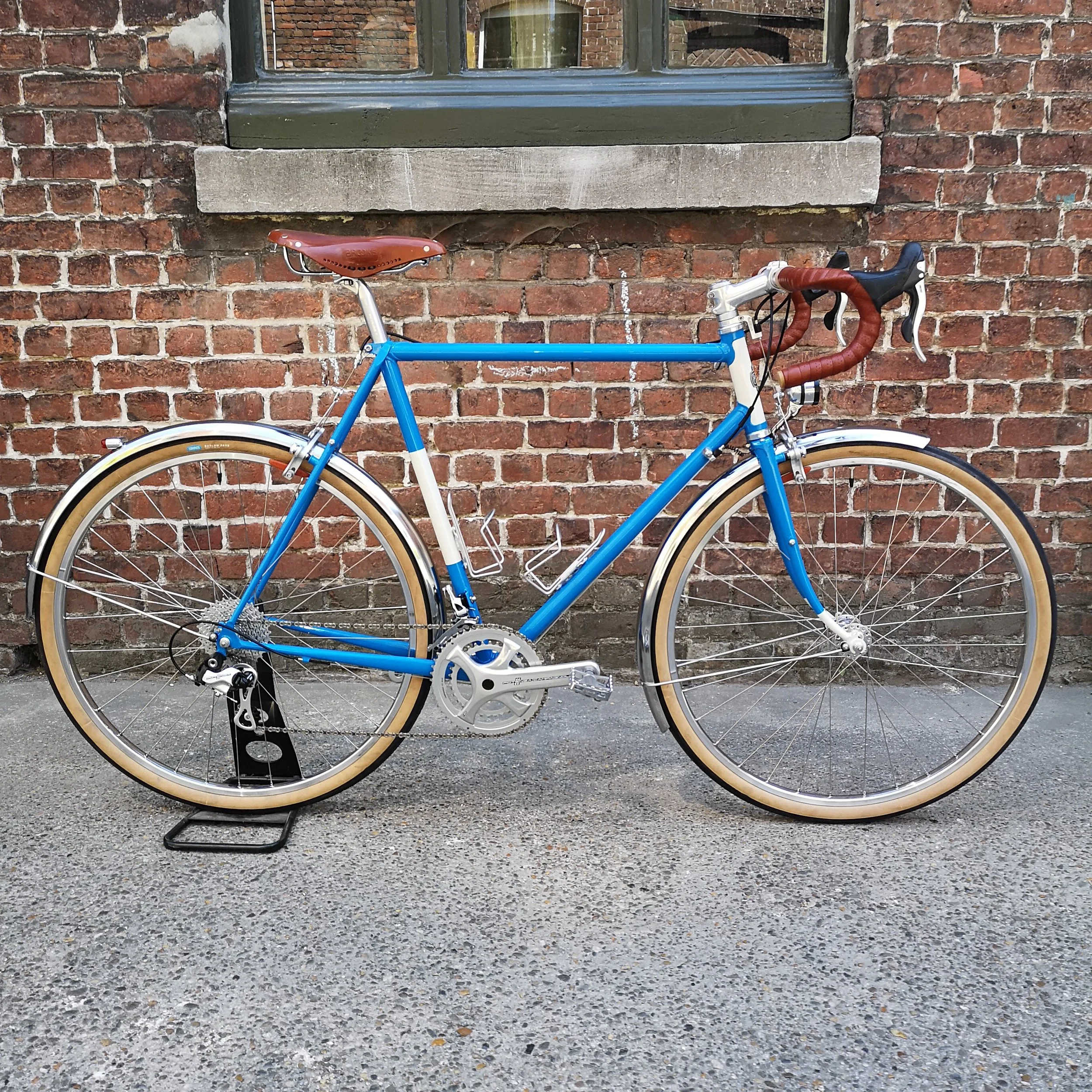 Le cadre est fait de tubes Columbus Spirit. Les pneus Compass Barlow Pass 700c x 38, la selle et la guidoline Brooks choisis pour assurer un comportement de confort.