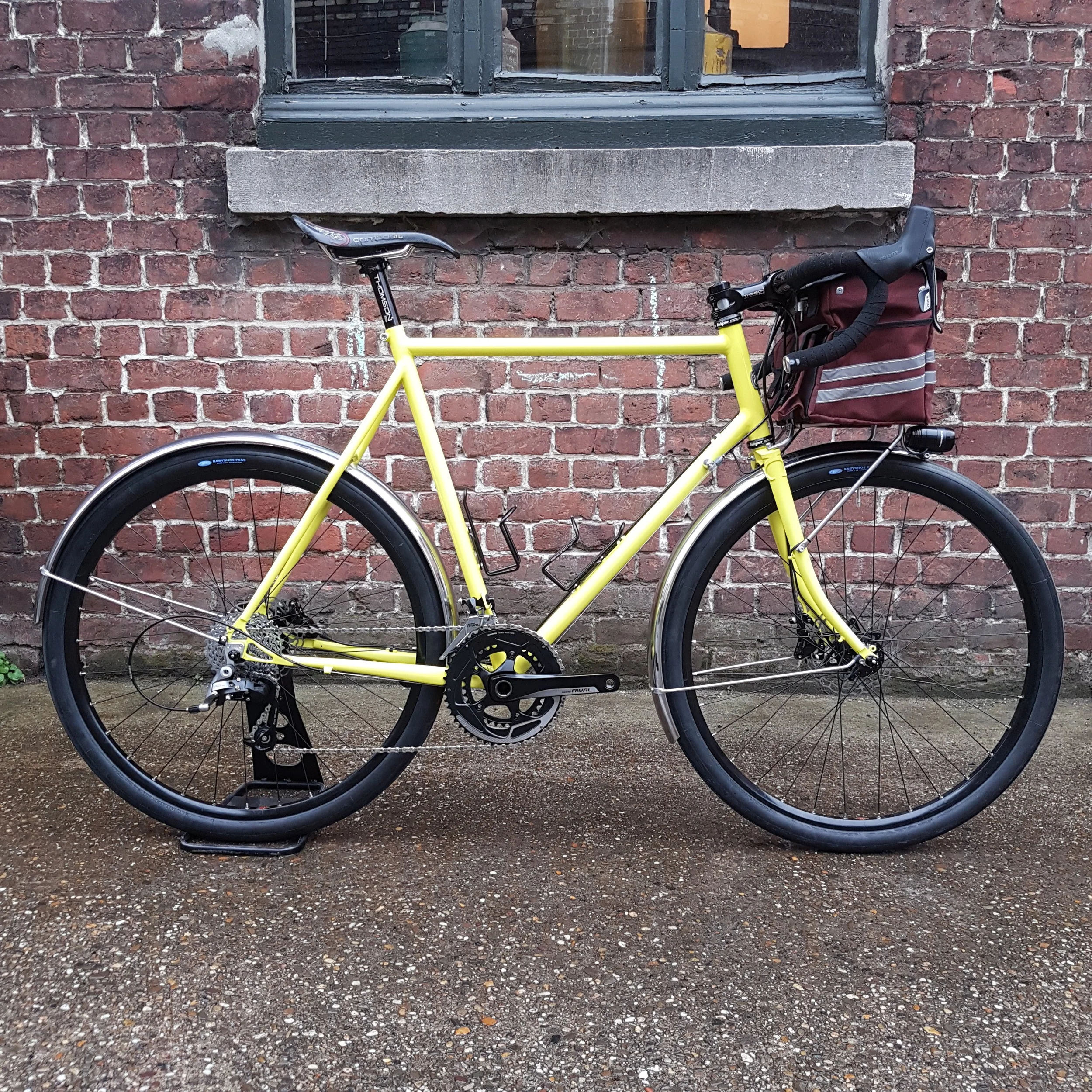 Les roues ont été construites par Cycles Get Lost. La sacoche et le support-bagage sont fabriqués sur mesure par Tim Tas & Rek. Le cadre est fabriqué à partir de tubes Columbus Zona, assemblés avec un groupe Sram Rival 22 Hydro, un jeu de direction Hope, potence et tige de selle Thomson. Pour les roues, j'ai utilisé des jantes Pacenti CL25 avec un moyeu arrière Hope Pro 4. Le moyeu avant est une dynamo SON 28 connecté à l'éclairage de Supernova. Les garde-boues sont fabriquées en France par Gilles Berthoud. Les pneus sont des super-souples Compass Babyshoe Pass 650bx42mm.